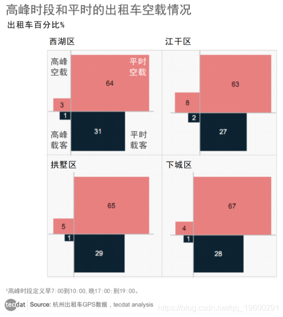 我们发现,高峰时段和平时,西湖区(21%和20%)和江干区(20%和13.8%)都是出租车数量最多的区,其次是下城区、拱墅区、余杭区等,下城区平时的出租车数量(13.2%)比高峰期(10%)更多。