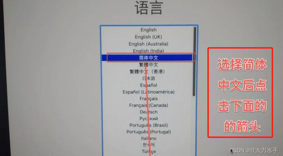 2、进入Recovery模式,选「简体中文」,然后按下面的箭头,如图所示: