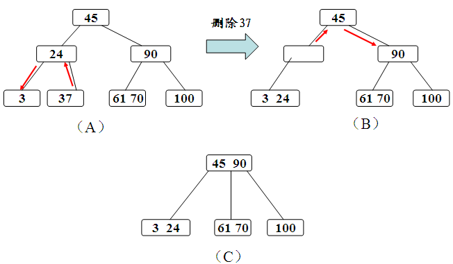 c、被删关键字Ki所在结点和其相邻兄弟结点中的的关键字数目均等于ceil(m/2)-1,假设该结点有右兄弟,且其右兄弟结点地址由其双亲结点指针Ai所指。则在删除关键字之后,它所在结点的剩余关键字和指针,加上双亲结点中的关键字Ki一起,合并到Ai所指兄弟结点中(若无右兄弟,则合并到左兄弟结点中)。如果因此使双亲结点中的关键字数目少于ceil(m/2)-1,则依次类推.