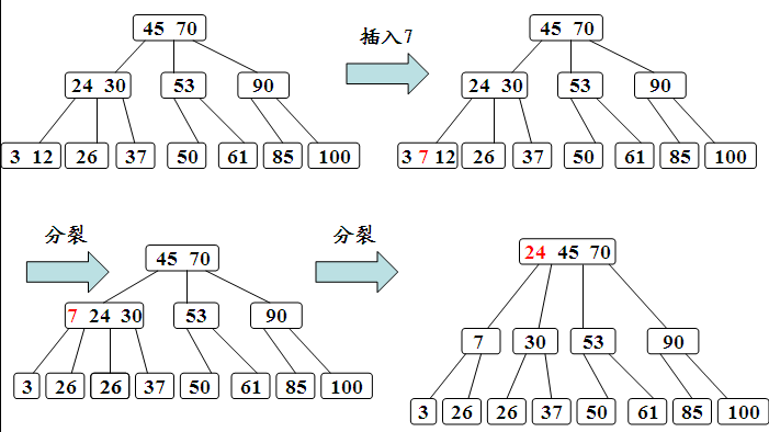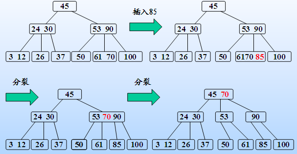 分裂的方法是:生成一新结点。把原结点上的关键字和k按升序排序后,从中间位置把关键字(不包括中间位置的关键字)分成两部分。左部分所含关键字放在旧结点中,右部分所含关键字放在新结点中,中间位置的关键字连同新结点的存储位置插入到父结点中。如果父结点的关键字个数也超过(m-1),则要再分裂,再往上插。直至这个过程传到根结点为止。