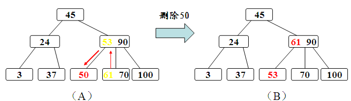 b.若该结点为非叶结点,且被删关键字为该结点中第i个关键字key[i],则可从指针son[i]所指的子树中找出最小关键字Y,代替key[i]的位置,然后在叶结点中删去Y。因此,把在非叶结点删除关键字k的问题就变成了删除叶子结点中的关键字的问题了。
