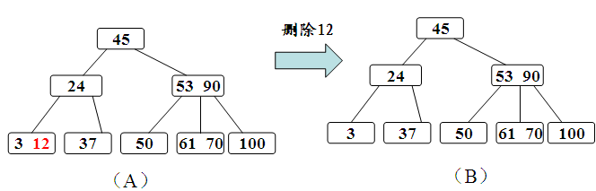 首先将要删除的关键字 k直接从该叶子结点中删除。然后根据不同情况分别作相应的处理,共有三种可能情况:
