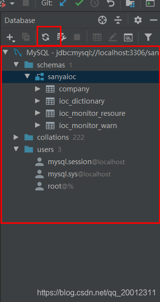 在database视图区域,点击刷新按钮,出现schemas内容表示获取到数据库配置信息,schemas即数据库的表信息