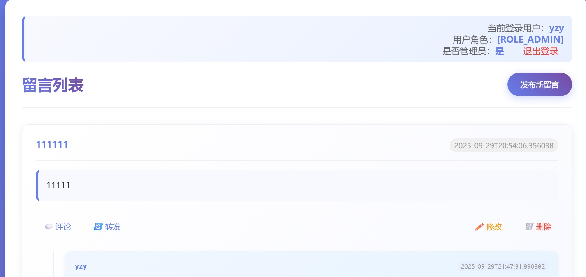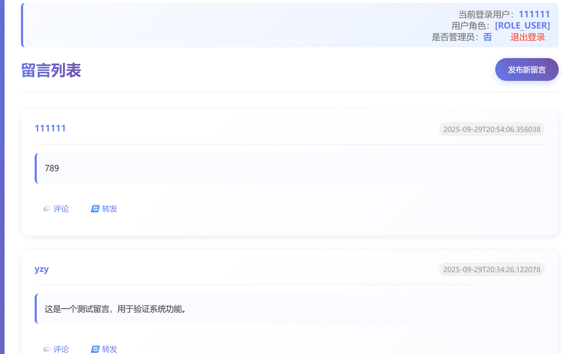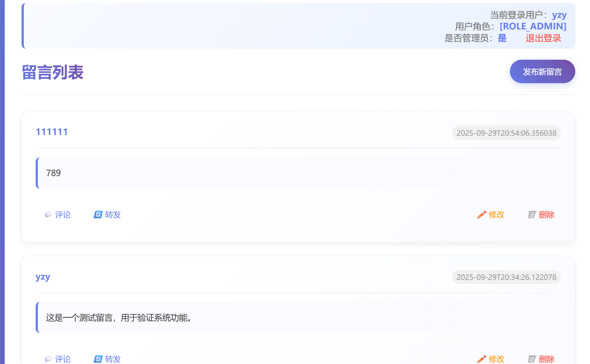 2.3管理员用户无需注册,直接登录即可留言,也可以转发并评论留言;
