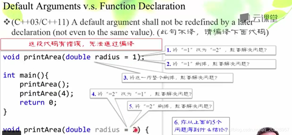 本文介绍了一段C++代码中关于函数声明与调用的修正方法。主要关注如何正确声明带有默认参数的函数,并展示了在主函数中调用该函数的例子。