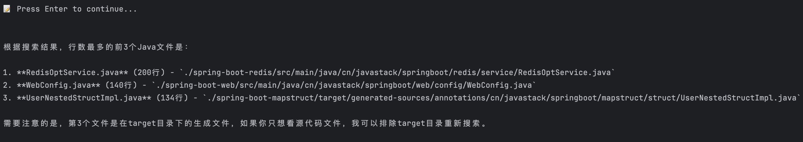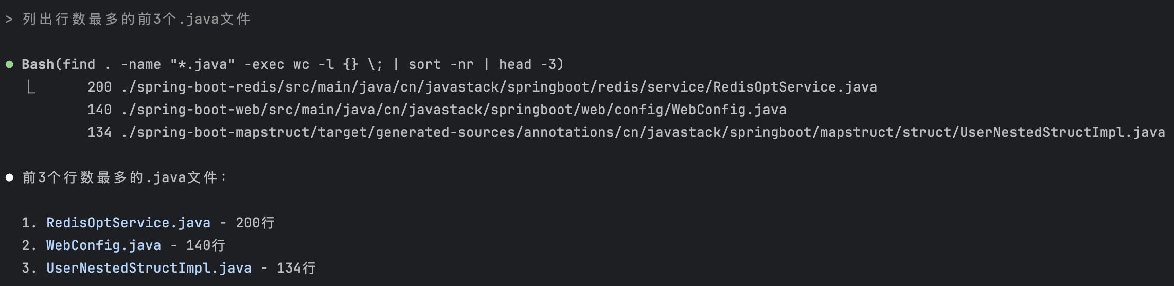 这是执行一次命令,它会列出满足条件的文件后退出 Claude Code 交互模式。