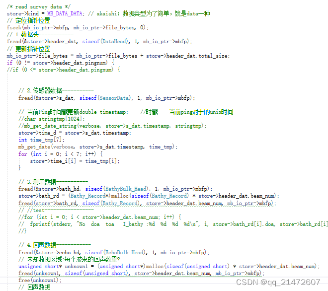 1.在mbsys_benthos.h中添加记录声纳数据的结构体: 这个结构体主要根据自己如何读取与存储声呐数据方便来决定,不用太考虑官方模板给的形式。因为最终MBsystem提取声呐数据有专门的函数接口mb_*_extract(),通过MBsystem定义的传参提取数据,而不是这里自己定义的结构体。