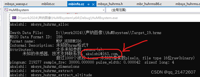 控制台入口main函数使用mbinfo.cc或mblist.cc中的入口就行了,二选一,用一个main函数,剩下的一个可以先注释掉。成功生成解决方案后就可以命令行调用了,比如mbinfo的命令行参数:mbinfo -F 286 -I "D:\\work2024\\声纳图像\\多波束目标数据\\240\\广西北海_空D\\Target_19.hrms" -V 3