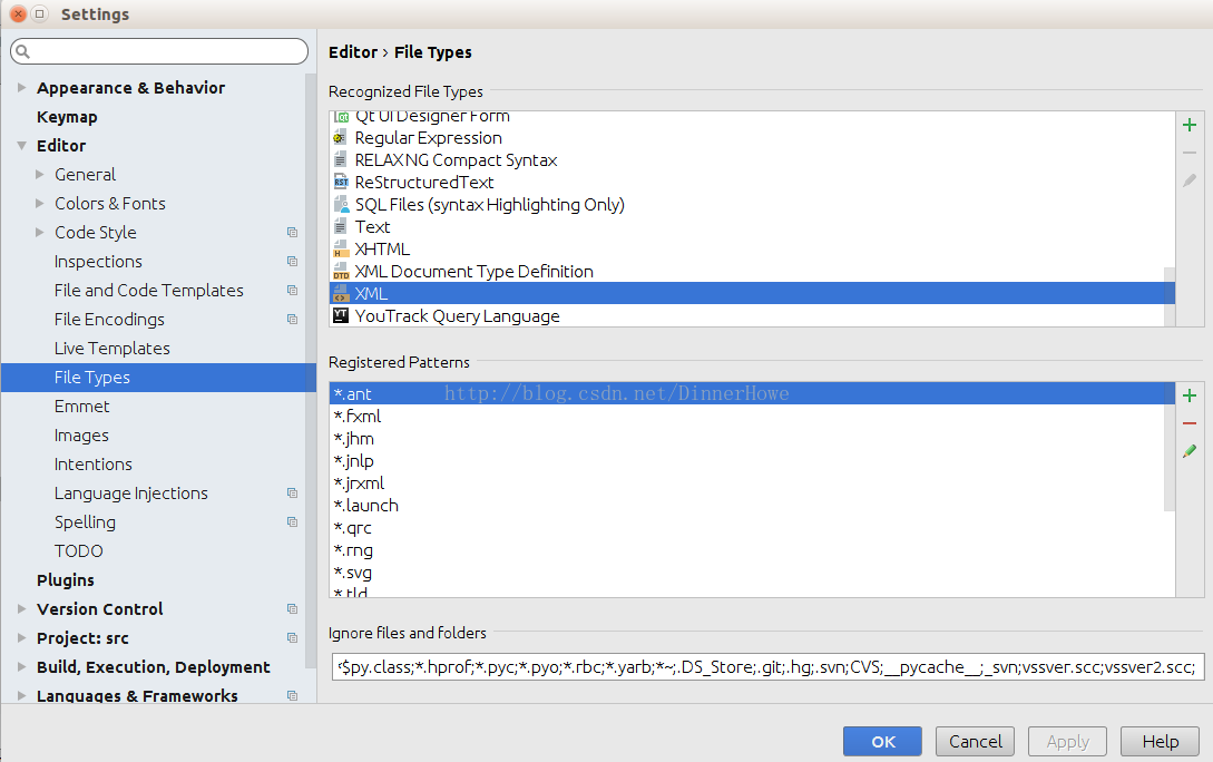 具体做法就是在file/settings里面打开File Types 选中XML
