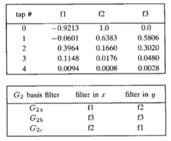 G2 x-y可分离基组的9—TAP过滤器。 (滤镜f1 和f2 具有偶数对称性; f3具有奇数对称性。这些滤镜取自表III,采样间隔为0.67。使用表Ⅲ 的插值函数。)