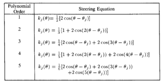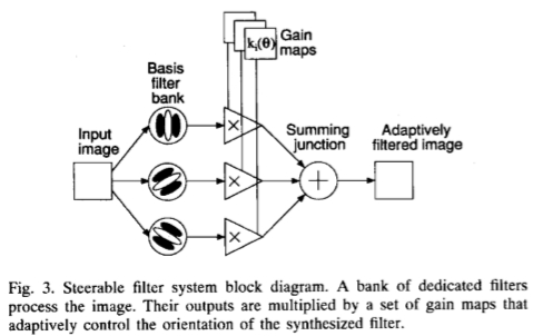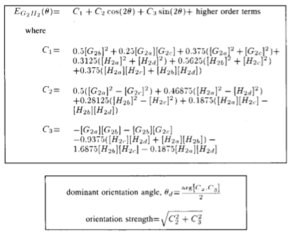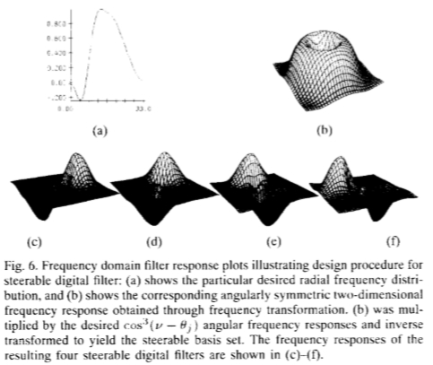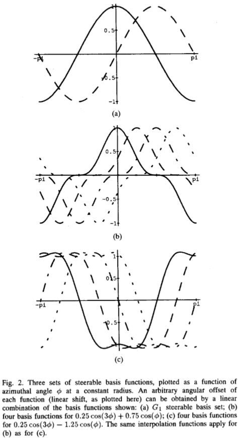 查找滤波器在许多方向上的响应的一种方法是应用同一滤波器的许多版本,每个版本在角度上的一些小旋转都彼此不同。一种更有效的方法是应用对应于几个角度的几个滤波器,并在响应之间进行内插。然后,需要知道需要多少个过滤器以及如何在响应之间正确地内插。使用正确的滤波器设置和正确的插值规则,就可以确定任意方向的滤波器的响应,而无需显式应用该滤波器。