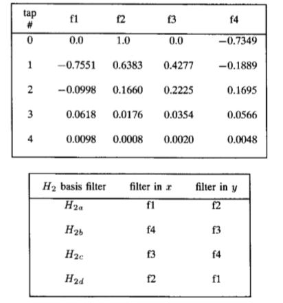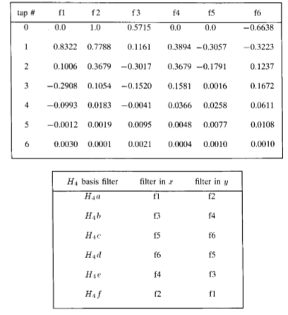 H4的x-y可分离基础集的13-TAP过滤器。 (抽头0为0.0的滤波器具有大约抽头0的奇对称性;其他滤波器具有偶数对称。这些滤波器取自表IX,采样间隔为0.5。使用表IX的插值函数。)