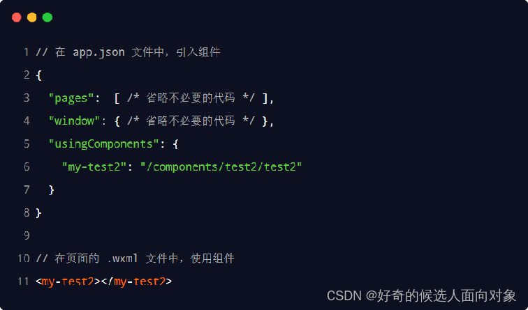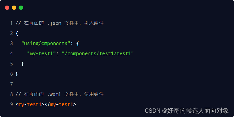 在页面的 .json 配置文件中引用组件的方式,叫做“局部引用”。示例代码如下: