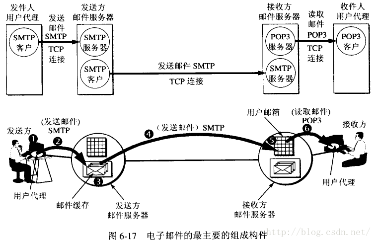一个电子邮件系统应具有三个主要组成构件,用户代理、邮件服务器、SMTP和POP3(注:POP3是邮局协议(Post Office Protocol)的版本3),如下图: