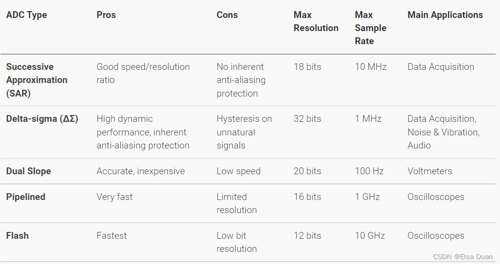 缺点:必须在外部添加抗混叠滤波;与delta-sigma ADC相比,比特分辨率和动态范围有限。