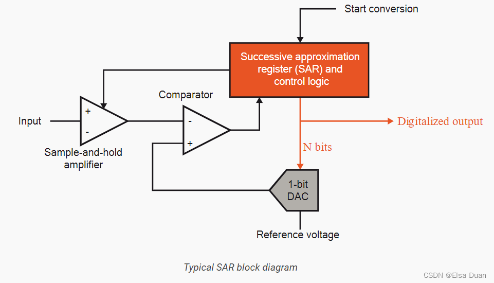 一个模拟参考电压作为模拟输入,采样保持后被送入比较器,比较器将比较结果发送给SAR,这个过程持续“n”次,“n”是ADC本身的位分辨率,直到找到最接近实际信号的值。
