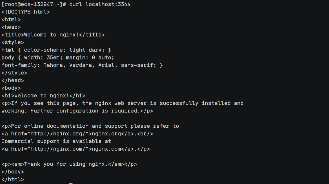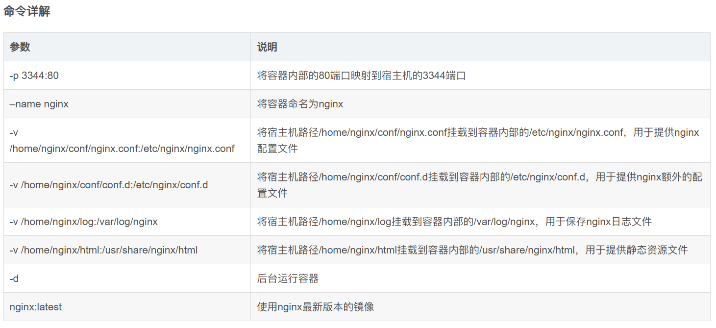 | -p 3344:80 | 表示将本机的3344端口映射到nginx镜像的80端口 |