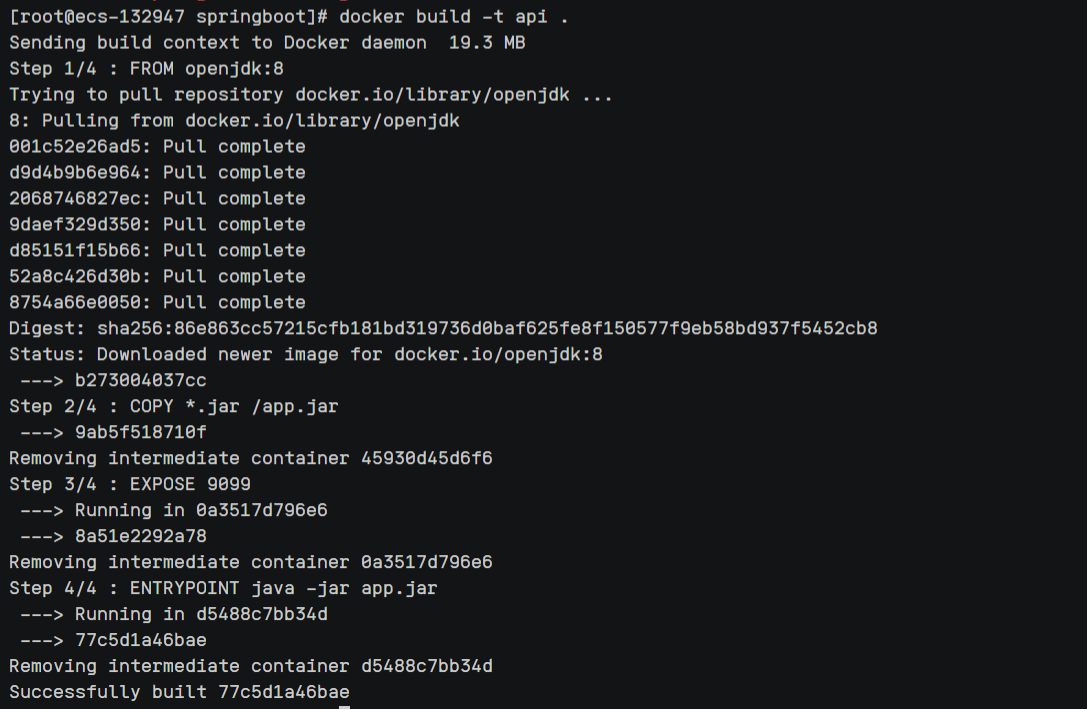 docker build -t api . #点千万别漏了,这里取名镜像为api,可以随便取名!