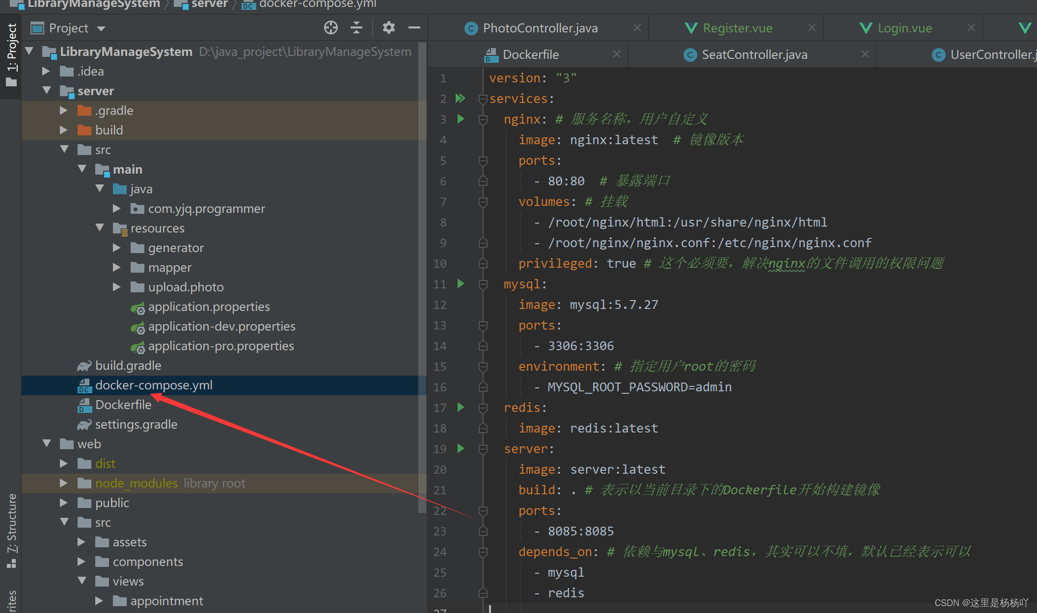 配置文件中MySQL和Redis的IP地址要改成docker-compose.yml文件中的服务名称。
