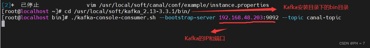 在Kafka服务器上的安装目录下的bin目录,执行以下语句,消费canal-topic