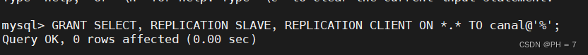 GRANT SELECT, REPLICATION SLAVE, REPLICATION CLIENT ON *.* TO canal@'%';