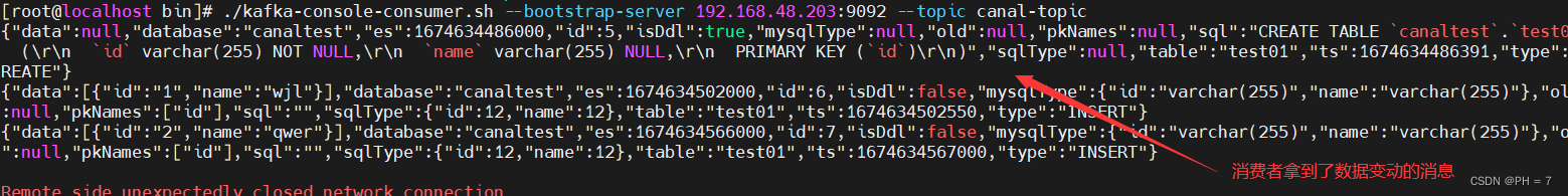 4.在canaltest数据库随便建一张表,做增删改的操作,Kafka的canal-topic消费者就能接收到数据变化的消息