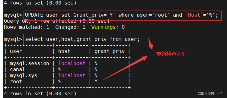 UPDATE user set Grant_priv='Y' where user='root' and `Host`='%';