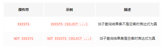 有时候外层查询并不关心子查询中的结果是什么,而只关心子查询的结果集是不是为空集,这时可以用到下边这两个操作符