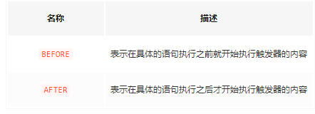 {INSERT|DELETE|UPDATE}表示具体的语句,MySQL中目前只支持对INSERT、DELETE、UPDATE这三种类型的语句设置触发器。