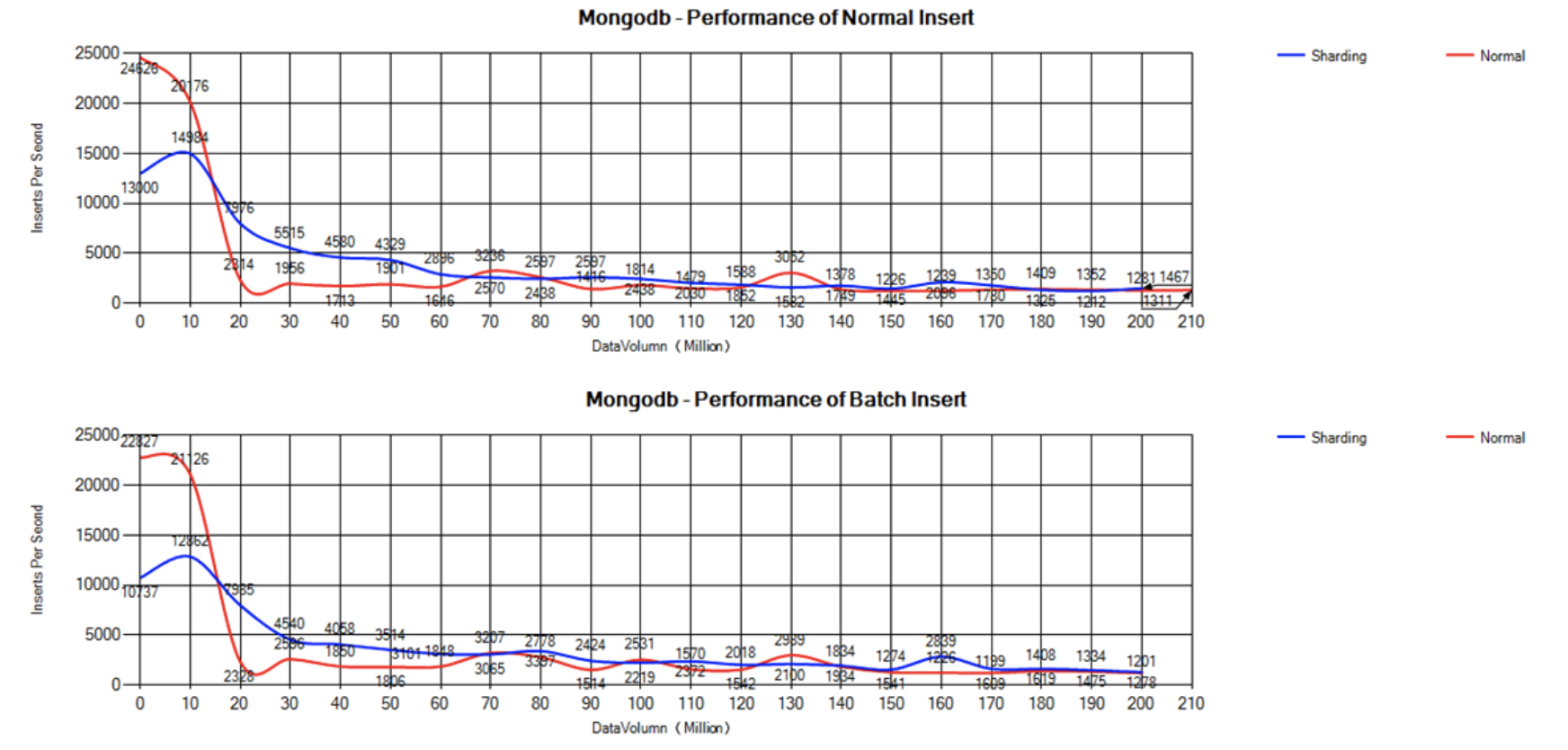 如上图所示,为测试MongoDB集群的插入性能开销示意图,测试服务器使用的是CentOS操作系统,24GB内存。这里分别测试了MongDB的单条记录插入和批量插入在单机模式和Sharding模式下的插入效率。可以看出,当MongDB单集合数据量到达2000万条的时候,无论是单机模式还是sharding模式插入性能都出现了陡降。