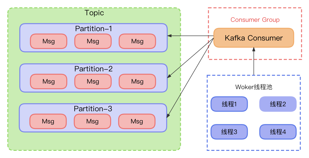 项目中原本的Kafka的消费模型虽然也是采用的线程池的方式,但是采用的是每一个线程维护一个Kafka Consumer的方式来实现的,如下图所示: