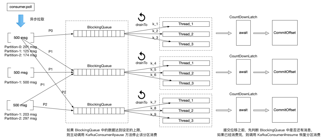 在消费前,创建一个 CountDownLatch,计数为本次消息数量。消费逻辑中,在 finally 中执行 countDown 操作,主线程阻塞等待本次消息消费完成。为了保证手动提交位移的正确性,只有当本次拉取的消息全部消费完毕后才进行位移提交。 -