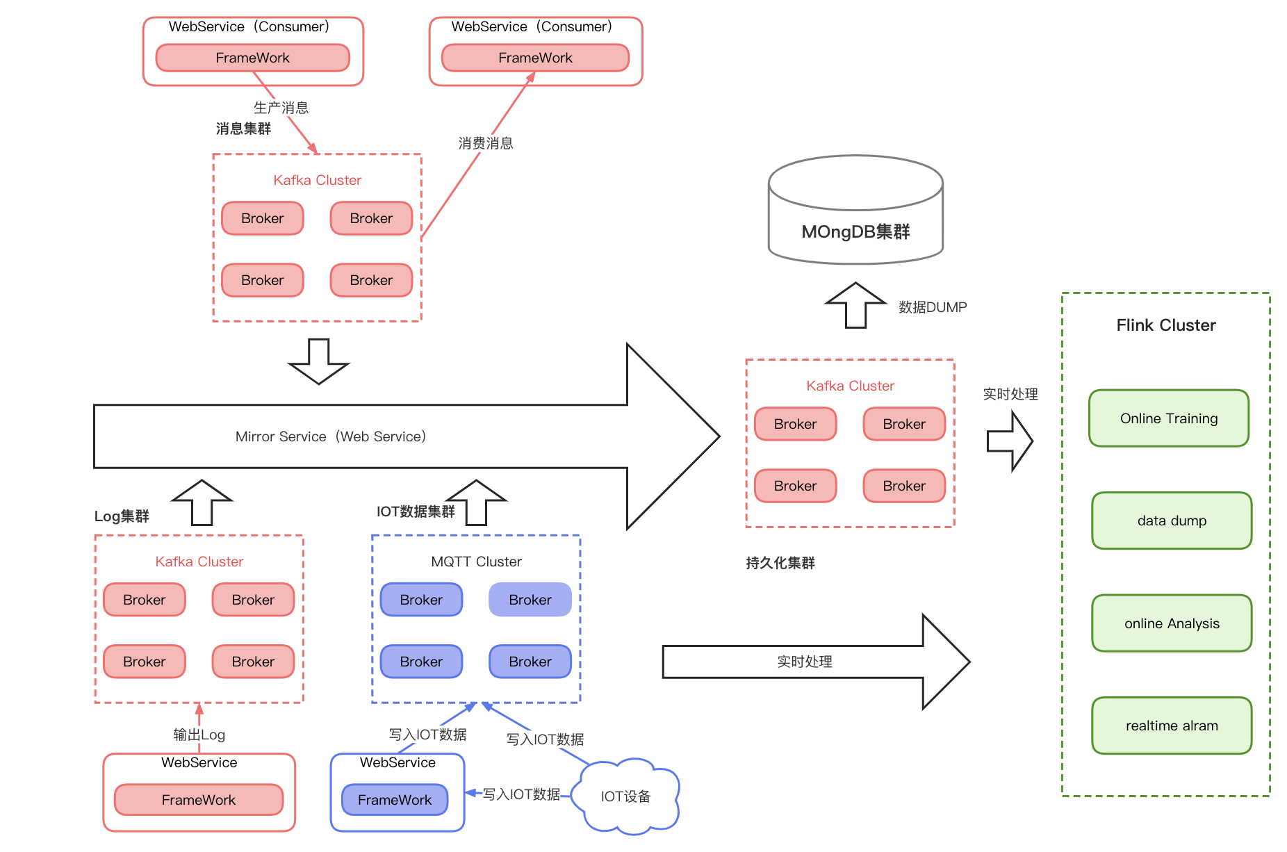 此外,作为整体解决方案,我们还引入了数据Mirror服务(Web Service),专门负责将数据从消息集群、LOG集群传输、IOT数据集群传送到持久化集群以及分发到web前端进行实时展示。