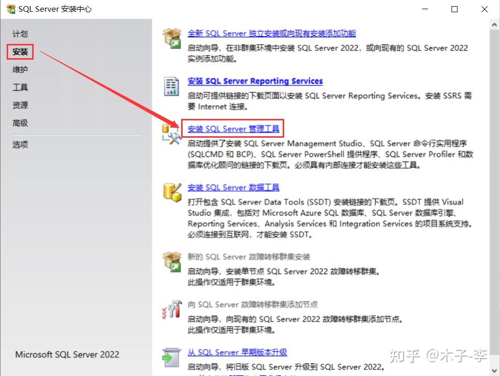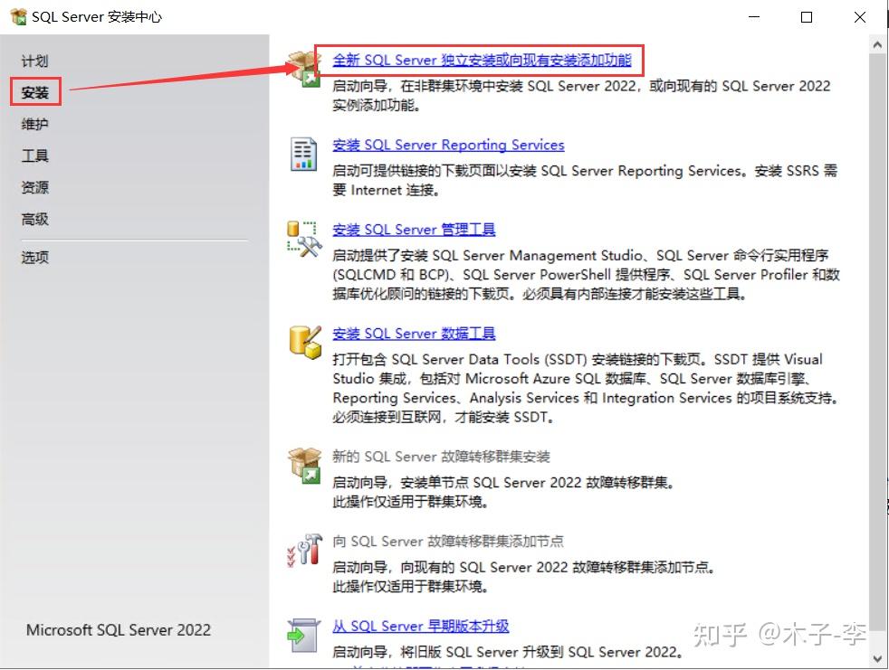 - 安装完成之后,出现这个页面,选择【安装】-【全新 SQL Server 独立安装或向现有安装添加功能】