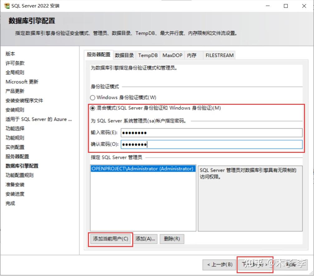 - 数据库引擎配置:身份验证模式选择【混合模式】-【设置sa账号密码】-【添加当前用户】-【下一步】
