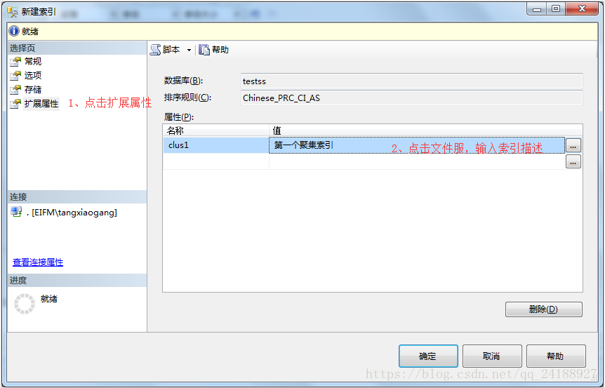 6、在新建索引弹出框中-》点击扩展属性,点击文件编辑符,输入索引描述-》单击确定。