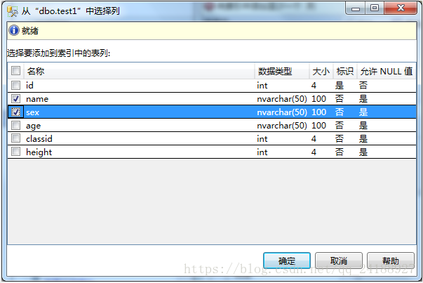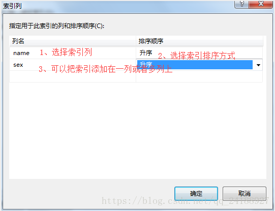 4、在索引列弹出框中-》选择索引列-》选择排序方式-》可以把索引建在一列或者多列上-》点击确定。