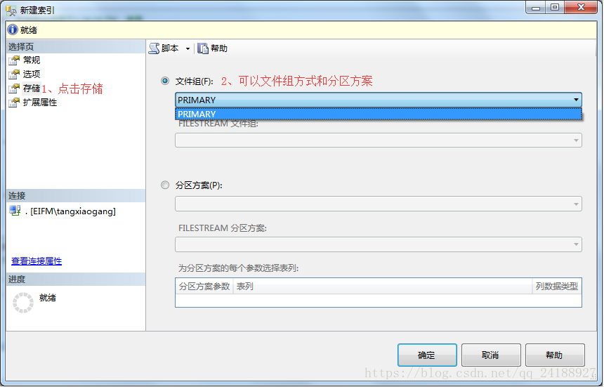 5、在新建索引弹出框中-》点击存储,可以选择默认文件组和分区方案,也可以自行配置。