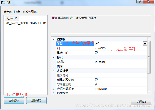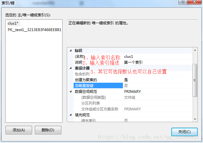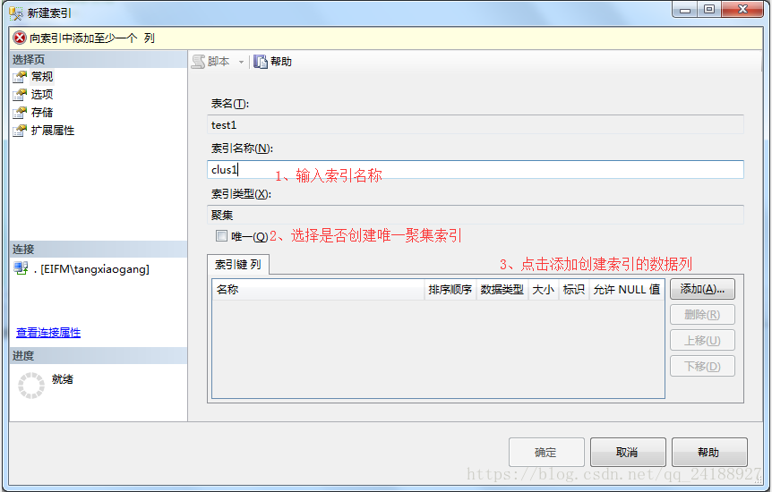 2、在新建索引弹出框-》在索性名称中输入索引名称-》选择是否创建唯一聚集索引-》点击添加,添加要添加索引的数据列。