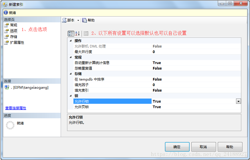 4、在新建索引弹出框中-》点击选项,关于选项配置可以选择系统默认,也可以根据需要自己配置。
