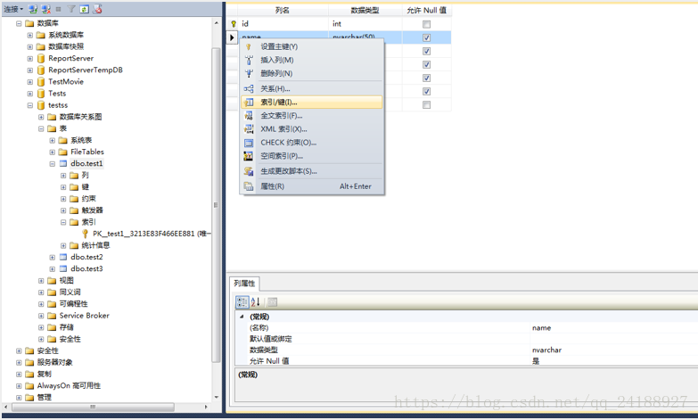 2、在表设计窗口-》选择要添加索引的数据列-》右键点击-》选择索引/键。