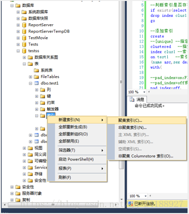 1、连接数据库,选择数据库-》展开数据表-》右键单击索引文件夹-》选择新建索引-》选择聚集索引。
