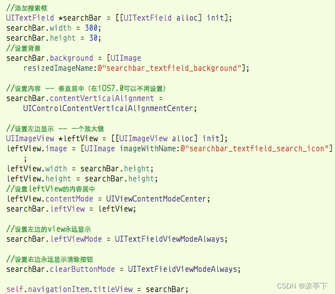 在HMDiscoverViewController类的viewDidLoad方法中,添加搜索框,由于系统的UISearchBar不能满足要求,所以通过UITextField控件来创建搜索框,如下: