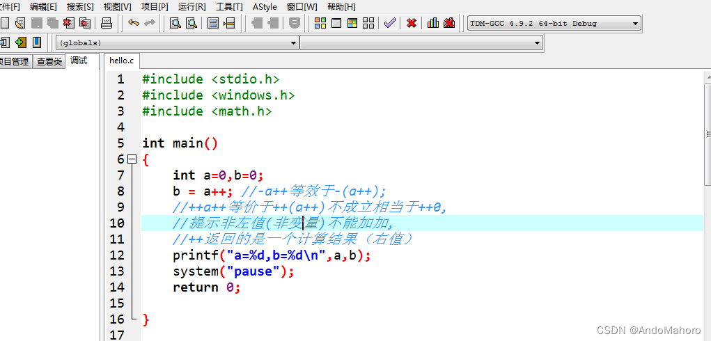 本文通过一个简单的C语言程序示例,解释了预增量`++a`和后增量`a++`的区别。后增量操作符`b=a++;`中,`b`获取的是`a`的旧值,而`a`之后被增加1。同时,尝试使用`++a++`会引发错误,因为非左值(即非变量)不能进行两次连续的自增操作,这表明`++`操作符返回的是一个右值,而非左值。