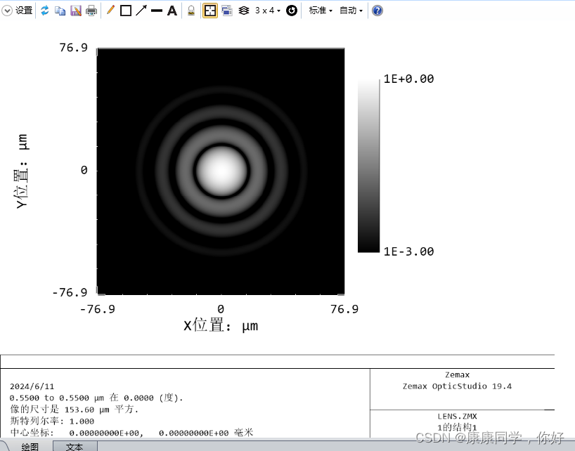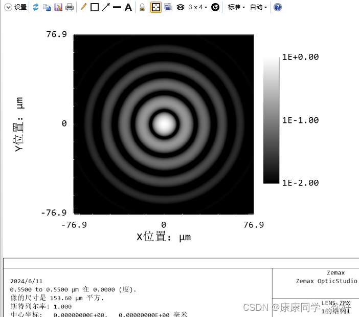 注意观察图8中的衍射图像,第一个暗环的半径为19um左右,与图3中点列图中的爱里斑半径明显不同。这是因为,爱里斑的半径是以系统设置的入瞳直径为基准计算的,不包含后来设置的光阑面的影响;而点扩散函数PSF计算的结果是包含光阑面的影响的。