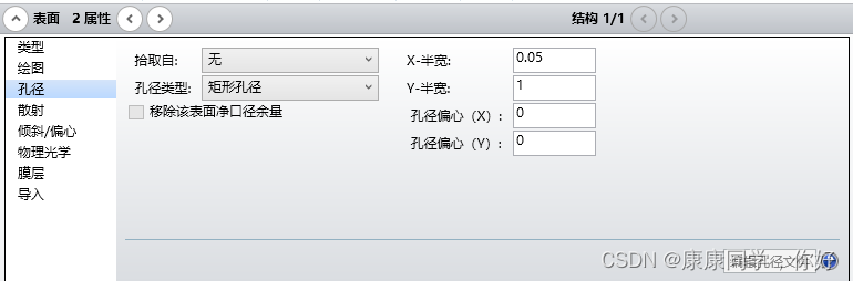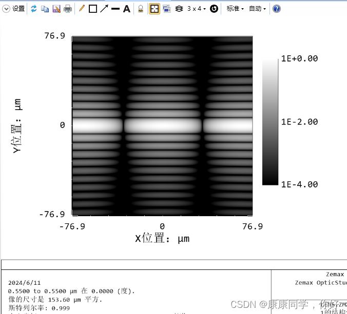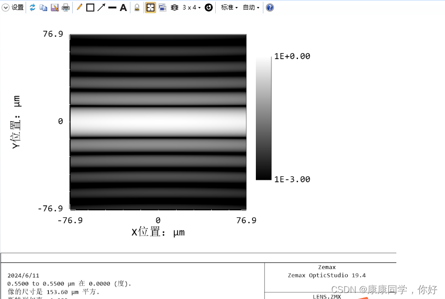 接着,可将矩形光阑变为狭缝,只要将其中一个边长减小到足够小即可。如图10所示,将便面2的矩形孔径减小为0.05mm,Y方向保持为1mm。然后更新点扩散函数分析图,如图11所示,即为狭缝衍射的图形。不过,需要注意的是,孙然矩形狭缝光阑的x方向为窄方向,但经过透镜变换后,衍射条纹的排列确实沿着Y方向,烟味孔径尺寸小,所以聚焦后的衍射极限尺寸反而更大;而Y方向因为孔径尺寸大,所以聚焦后的衍射极限尺寸却更小。