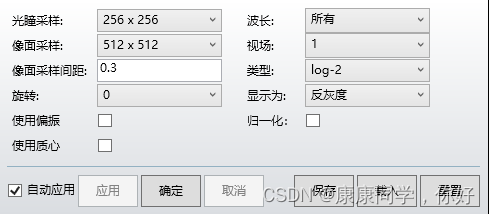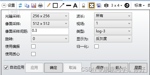 设置点扩散函数计算和显示参数,如图4所示。为了使图像显示更为平滑细锐,采样率要设置得适当高一些,尤其是像面图样采样率;而入瞳采样是根据入瞳直径的尺寸进行采样,而不是根据光阑面的尺寸进行采样,所以光阑和入瞳的尺寸差异不能过大。注意,像面采样间距是图样采样步长,默认的情况下,软件根据图像条件自动匹配图样显示尺寸;如果自行设置,图像尺寸由像面采样决定。在显示类型中,为了增强可视效果,采样对数化强度分布,即Log类型,根据自己的喜好选择底数即可。显示方式,可选择灰度、伪彩色等等,也是根据自己的喜好选择。