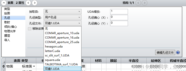 在zemax提供的面型孔径类型中,有圆形孔径和矩形孔径,还有托运啊形孔径、但是zemax提供了一种用户自定义面型孔径类型。用户可以通过文件自己编辑孔径类型。该文件孔径以UDA为后缀命名。用户在文本文件中编辑孔径数据。然后文件编辑后的存放路径为...\zemax\objects\apertures。