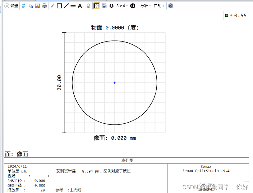 然后打开点列图,并设置显示爱里斑尺寸,如图3所示,可以看到,爱里斑半径为9um左右。接着,在主菜单中打开分析—>点扩散函数—>惠更斯PSF惠更斯点扩散函数分析窗口。
