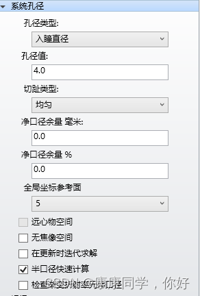 系统参数设置中,入瞳直径设为4mm,其他默认即可,在镜头数据列表中,表面2为光阑面,在面型参数设置中,将孔径类型设为圆形孔径,最小孔径为0,最大圆孔半径为1mm,如图2所示。也就是说,通常要把光阑的孔径设为小于入瞳直径的尺寸,但又不能太小,否则可能会因为计算时采样太小而导致结果失真。